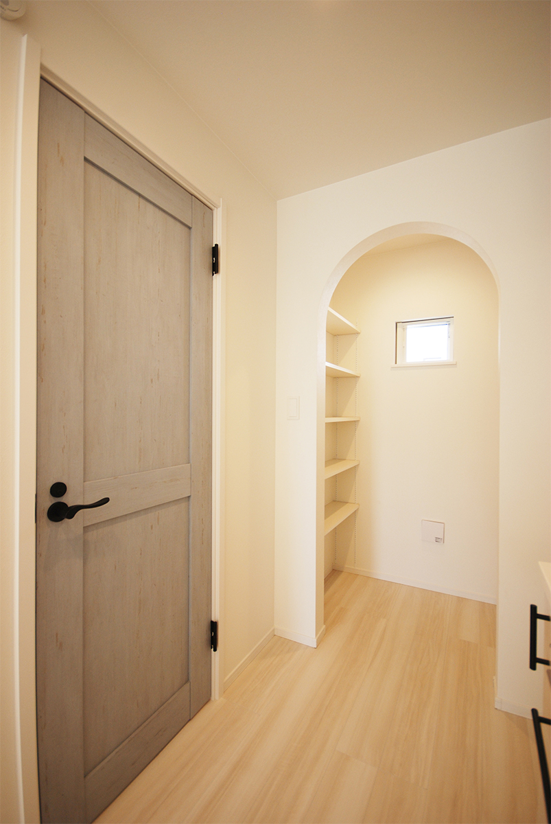 濃さを変えた木目調のバルコニーの手すり壁が建物のアクセントになっている。パントリーのアールの開口部がLDKの空間をゆるく仕切る。