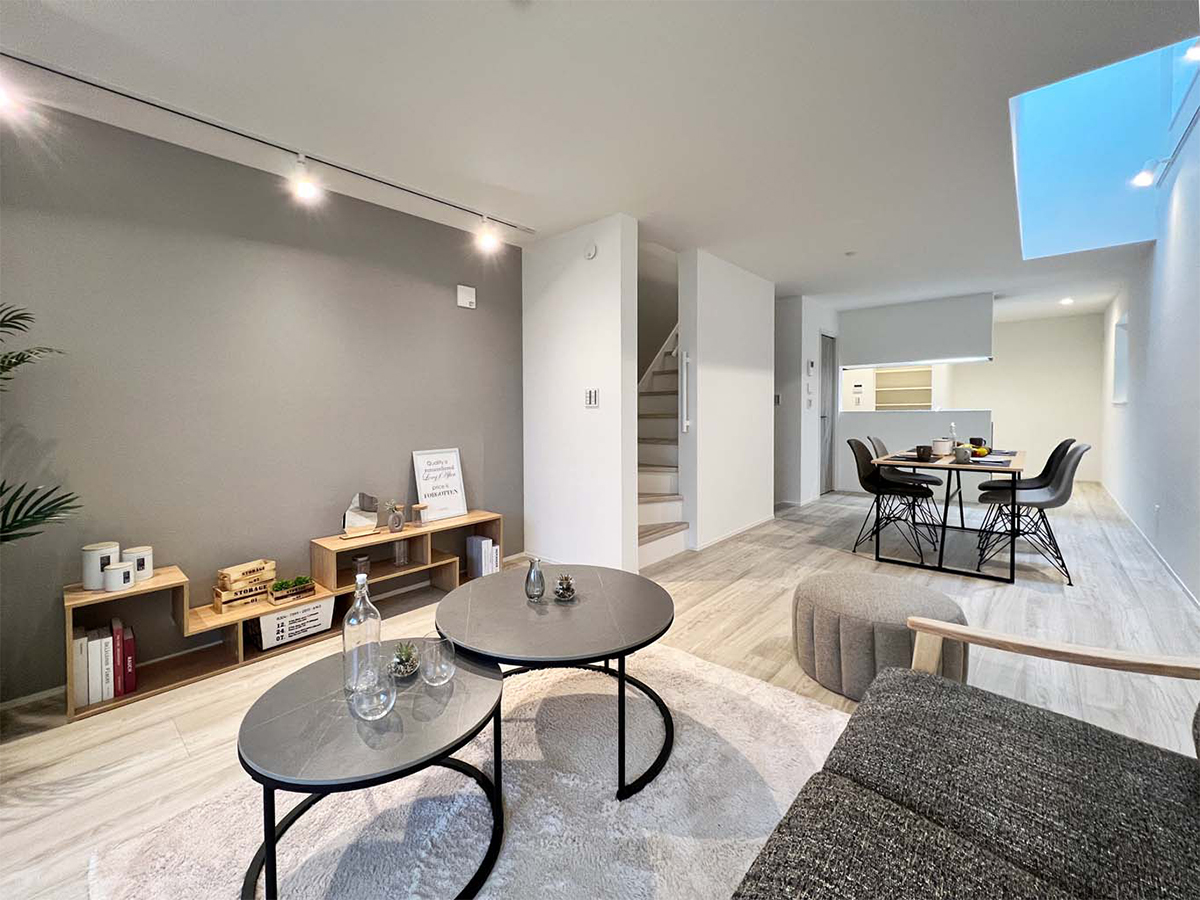 吹き抜けのある2回リビングはトップライトから注ぐ自然光でとても明るく、また、3階廊下にはリモートワークや子供の勉強に便利です。